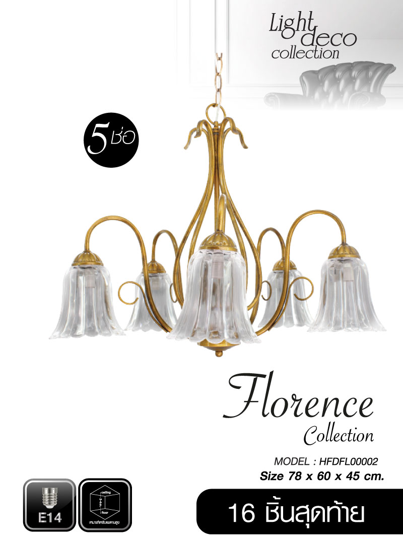 - โคมไฟห้อยเพดาน รุ่น FLORENCE ขั้ว E14วัสดุทำมาจากโคมแก้ว และโลหะใช้สีอบพิเศษ โคมแก้ว คุณภาพสูง ทนทาน เหมาะสำหรับการแต่งบ้านหลากหลายประเภท อายุการใช้งานยาวนาน ผลิตตามมาตรฐานยุโรป (CE)
